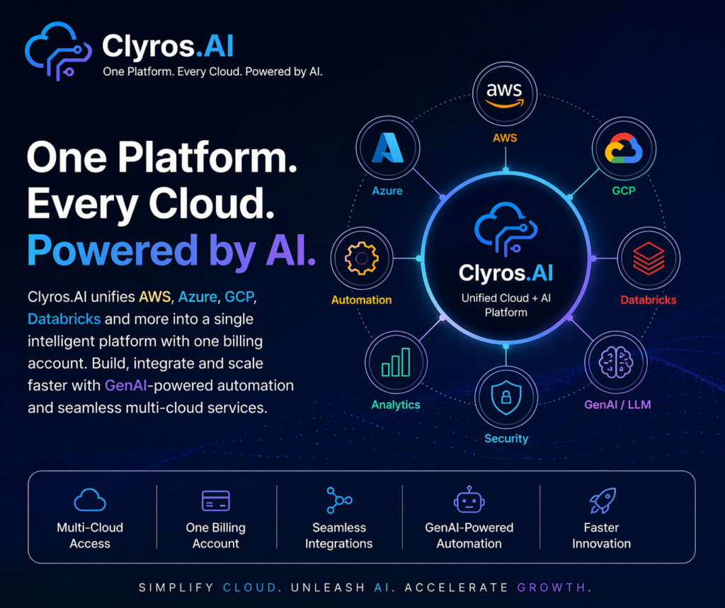 Clyros.AI is a next-generation cloud and AI platform built to simplify how teams build and scale. We unify AWS, Azure, GCP, Databricks, and more into a single platform with one billing account and built-in GenAI/LLM capabilities for automation, faster development, and seamless integration.